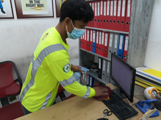 很快,6月份政府同意菲律宾子公司复产了,我依然每天第一个来公司,对门窗把手、办公桌椅、对讲机等办公场所每个角落打扫卫生、进行消毒,每天两次按时给员工测温,对疫情防控毫不放松。