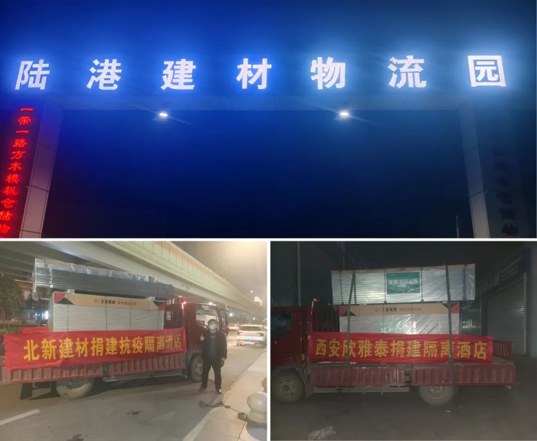 疫情就是命令,北新建材西北公司立即创建捐建工作小组,西北公司战略营销部总经理何亚东与经销商西安欣雅泰商贸有限公司持续配合,克服重重困难,联系车辆,从已经封闭的建材市场调配物资。经过3个小时的协调与装运,在社会各个环节的配合与支持下,晚上8时第一批龙牌石膏板轻钢龙骨等援助物资运抵项目现场,保障陕西建工集团连夜施工,为抗疫隔离酒店改造建设给予有力支持。