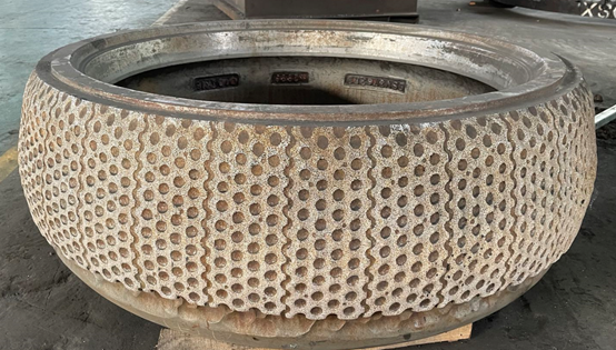 本次顺利获得省级制造业单项冠军企业(产品)认定的金属复合陶瓷产品,采用先进的陶瓷颗粒表面改性处理技术,结合耐高温无机溶胶粘接剂以及有限元设计并优化多孔网络结构,最终产品使用寿命在同等工况条件下比高铬铸铁高出2~5倍,降低了原材料及人工成本,提高了产量。