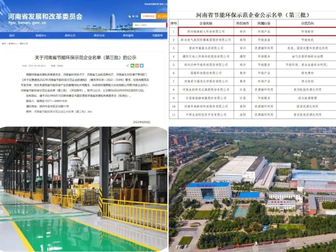 近期,河南省开展和改革委员会公布了《2022年河南省节能环保示范企业名单(第三批)》,郑州瑞泰耐火科技有限公司被认定为“河南省节能环保示范企业”。此次荣获“2022年河南省节能环保示范企业”称号,郑州瑞泰将以此为契机,持续发挥示范企业的价值导向和行业风向标作用,始终保持高度的社会责任感,坚持绿色和可持续的开展理念,坚定不移地走生态优先、绿色低碳的高质量开展道路,强化绿色低碳技术攻关和创新应用,不断推出绿色低碳环保产品,发挥节能环保示范企业作用,努力创造高质量开展新篇章。