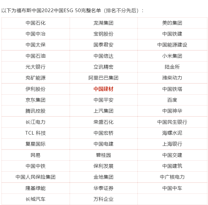 此次,中国ESG 50遵循联合国ESG框架和原则,从2022福布斯全球企业2000强(依据全球上市公司当年的营收、利润、资产和市值四个方面指标来排名)中选取了在ESG层面先行一步的50家中国企业。