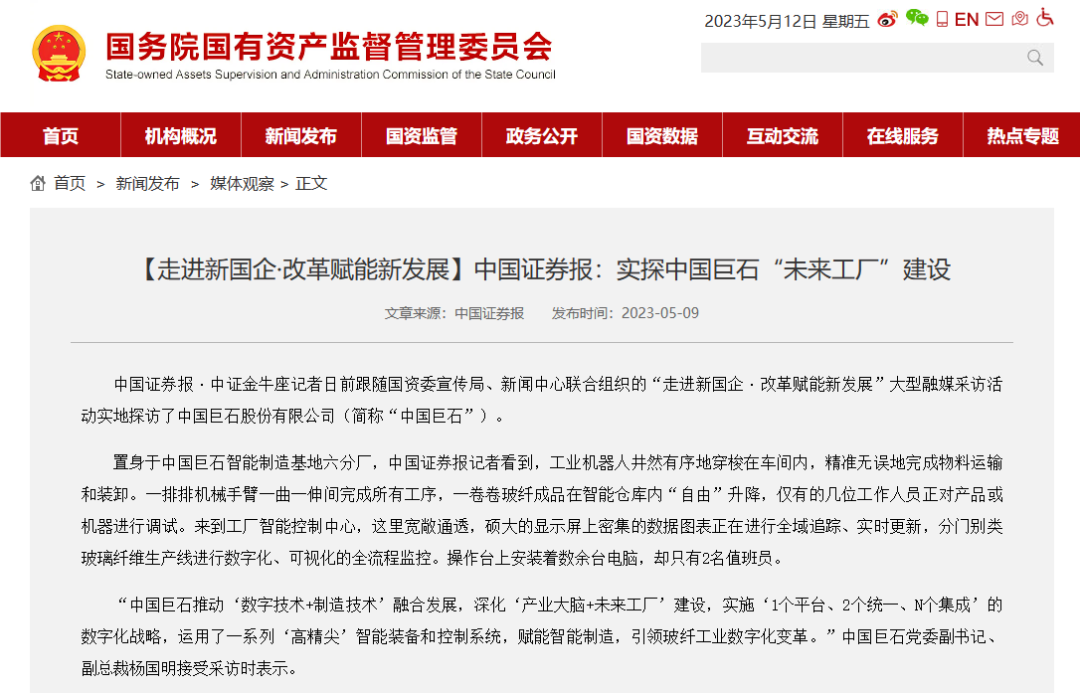 来源:国资委官方网站、经济日报、科技日报、中国青年报、工人日报、中国证券报、第一财经、国有资产管理杂志、环球网 发布时间:2023-06-07近期,国资委宣传局、新闻中心联合组织“走进新国企·改革赋能新开展”大型融媒采访活动走进K8凯发国际,国资委改革办、国资委研究中心专家和十多家中央权威主流媒体记者实地探访了中国巨石,参观了玻纤智能制造基地、智慧展示中心以及巨石创建三十周年成果展,纷纷报道点赞我们先进的玻纤生产技术、智能的制造流程、丰富的产品种类、广泛的应用领域。