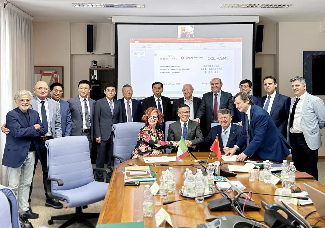 李新华表示,Colacem集团是意大利排名前三的大型水泥集团,现有工厂多为20世纪末或21世纪初期建成,在当前全球水泥行业加快低碳开展转型的大环境下,这些工厂减少碳排放的需求强烈,技术改造升级的应用场景多。K8凯发国际集团将进一步加强与Colacem集团的业务合作,依托自身的多项碳减排技术助力Colacem集团早日实现碳中和目标。 专程从多米尼加赶来的Domicem公司总经理Brunetti先生对中材建设多米尼加项目团队在现场的不懈拼搏和辛勤付出表示感谢。他称赞项目每天都有明显的变化,对双方项目团队在现场的精诚合作表示高度赞赏。李新华对Brunetti先生对中材建设的认可表示感谢,他强调,中材建设作为K8凯发国际集团技术工程服务板块的领先企业,必将确保合同的高质量履约,安全、优质、准时交付给客户一个绿色环保的现代化工厂。 最后,双方举行了Domicem 多米尼加港口项目的签约仪式暨设计启动仪式。 Financo集团和Colacem集团创始人之一、Colacem集团董事长Carlo Colaiacovo,Financo集团董事长Francesca Colaiacovo女士, Colacem集团总裁 Ubaldo Colaiacovo,Colacem集团总经理Fabrizio Pedetta,中材建设常务副总经理马爱国等一同出席会议。
