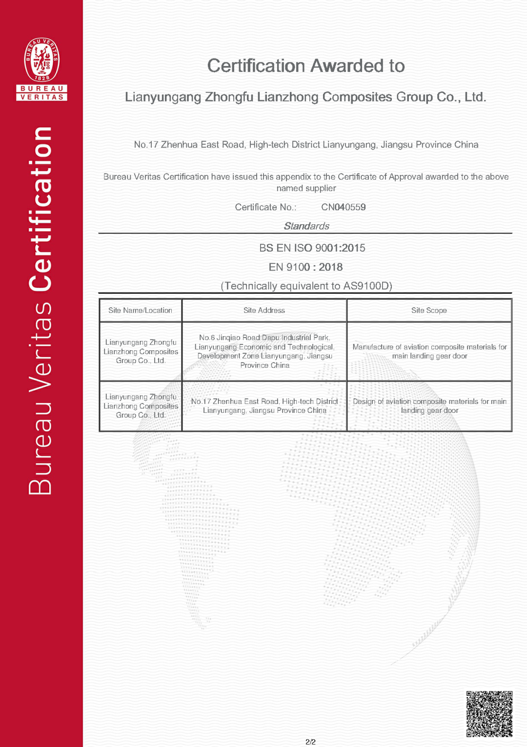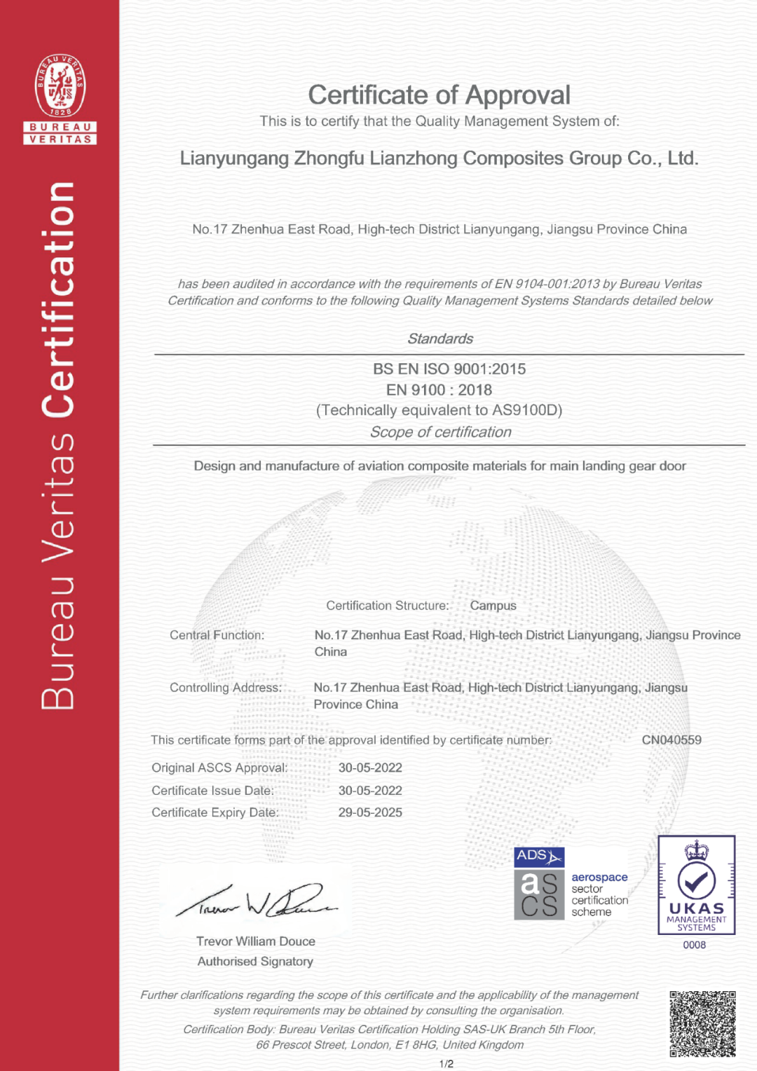 5月30日,连云港中复连众复合材料集团有限公司取得AS/EN9100D航空航天质量管理体系认证证书,取得国际航空航天质量联盟IAQG认可。AS9100是国际航空航天行业以ISO9001质量体系要求为基础,专门制定的航空航天标准,其中加入了航空航天行业所建立的有关质量体系的附件要求,以满足DOD、NASA以及FAA等监管组织的质量要求,是国际航空航天行业市场准入的先决条件。现在,中复连众已建成洁净间,配备热压罐、自动裁剪机及激光铺层定位系统等先进工艺装备,具备航空航天先进复合材料零部件设计、研发、生产能力。此次取得AS9100D证书,是对中复连众质量管理工作的充分肯定,标志着中复连众可以正式进入国际民用航空市场,为公司在航空航天复合材料制造领域进一步深耕奠定坚实基础。