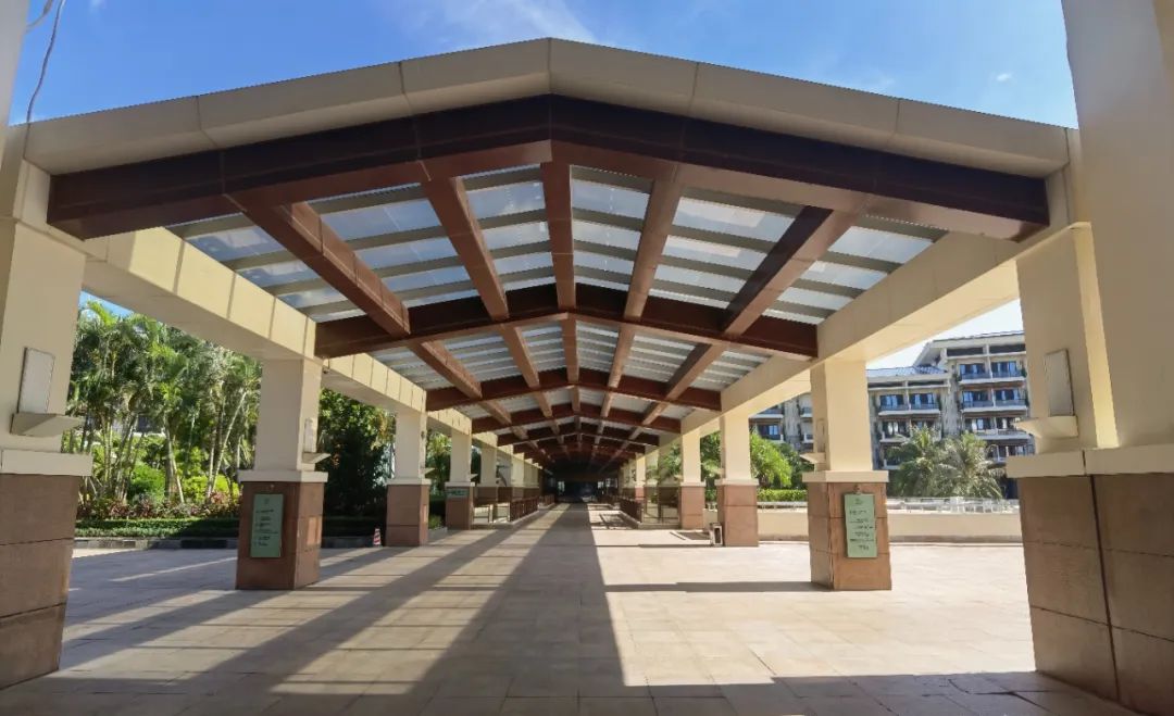 新闻中心前的阳光连廊使用了20%透光的三叠层大面积碲化镉发电玻璃作为连廊顶棚,使连廊既能够发电,又具备良好的采光效果和广阔的视野,建筑外观更加具有特色,营造出一种人与环境更为和谐的建筑氛围。相比传统的光伏产品,大面积碲化镉发电玻璃在形状造型、视觉通透性、安装角度、色彩图案及结构强度等方面都更具优势,最大程度地保障了阳光连廊的功能性、安全性和美观度。