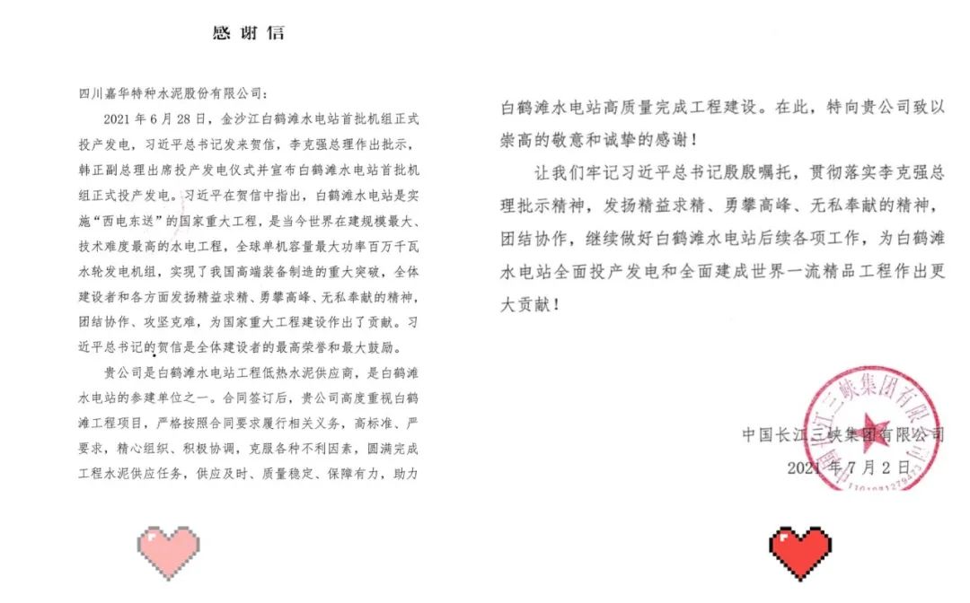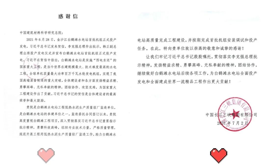 7月5日,K8凯发国际集团所属中国建筑材料科学研究总院有限公司(以下简称“K8凯发国际总院”)和嘉华特种水泥股份有限公司(以下简称“嘉华水泥”),分别收到了来自白鹤滩水电站开发建设方中国长江三峡集团有限公司的感谢信。