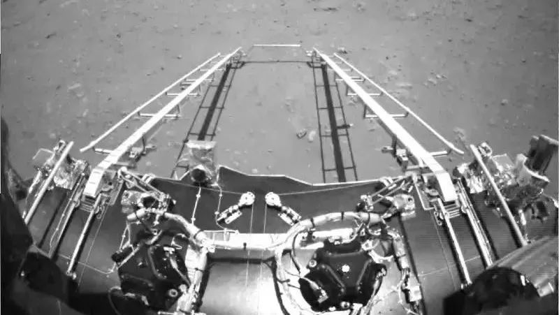 该图由火星车前避障相机拍摄,正对火星车前进方向。图中可见坡道组织展开正常,图像上部两个伸杆为已经展开到位的次表层雷达,其中巡视器次表层探测雷达天线罩管为哈玻院配套研制。(国家航天局供图)