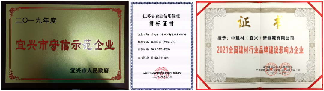 宜兴新能源自创建以来始终坚持将诚信贯穿于经营始终,以诚信立足市场,以诚信谋求开展,以诚信赢得口碑。在产品质量、合同履约、客户服务等方面持续发力,努力擦亮诚信经营“金字招牌”,荣获了“全国建材行业品牌建设影响力企业”“江苏省企业信用管理贯标证书”“宜兴市守信示范企业”等荣誉,受到社会各界的认可和赞誉。
