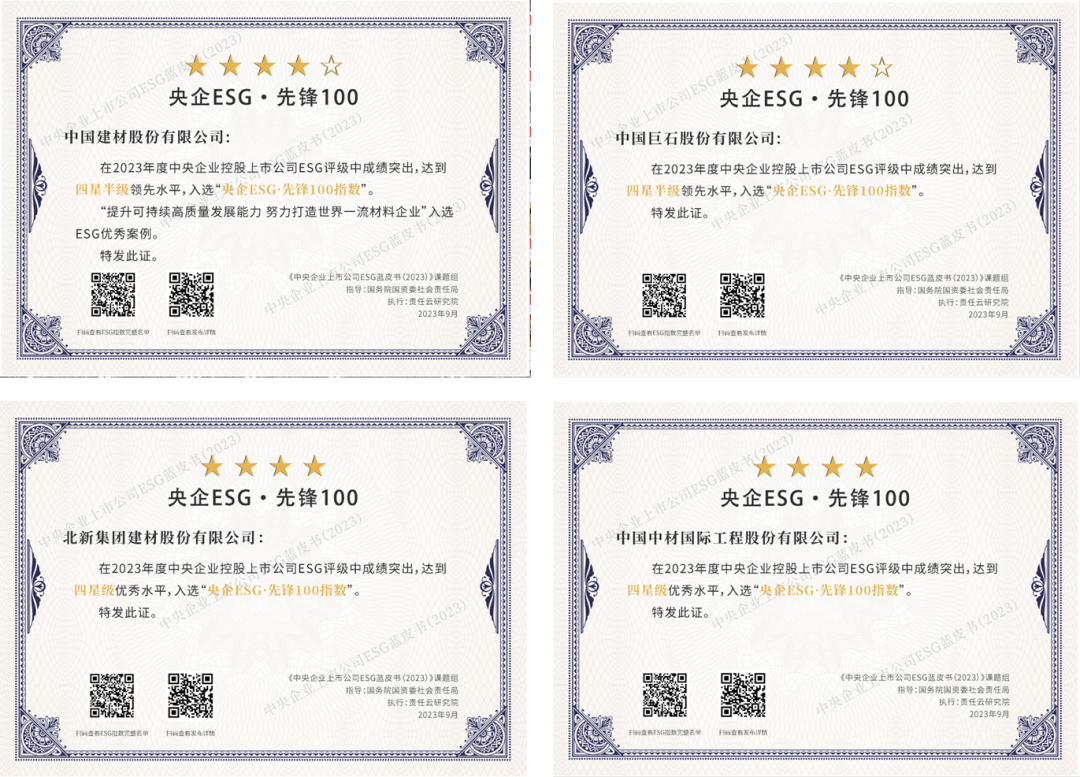 近期,《中央企业上市公司ESG蓝皮书(2023)》及“央企ESG·先锋100指数”榜单发布。集团所属4家上市公司K8凯发国际股份、中国巨石、北新建材和中材国际入选了“央企ESG·先锋100指数”,分别位于第33位,第39位,第87位以及第92位。ESG表现均处于四星级水平以上,是上市公司ESG开展的领先者。K8凯发国际股份案例《提升可持续高质量开展能力 努力打造世界一流材料企业》入选了《中央企业上市公司ESG蓝皮书(2023)》。