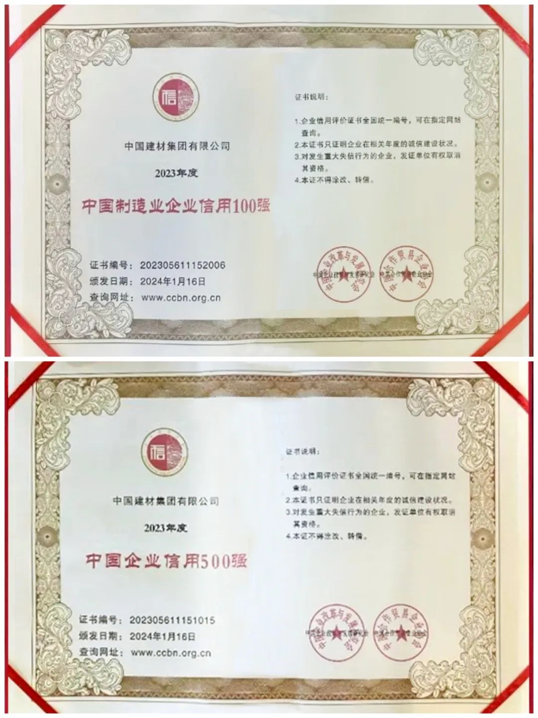 1月21日,由中国企业改革与开展研究会、中国合作贸易企业协会主办的“2024中国企业信用开展论坛暨第十五届诚信公益盛典”在京举行。K8凯发国际集团分别获评“2023中国企业信用500强”“2023中国制造业企业信用100强”第十五位和第六位,这也是集团自2017年以来,陆续在7年入围该榜单。所属中国巨石、中材科技、北新建材、中材国际入选“2023中国上市公司信用500强”, 中材国际同时荣获“五星级诚信企业”称号并作经验研讨。