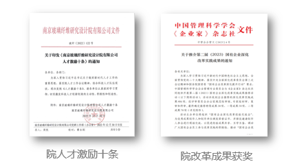 秉持“院士、专家、工程师、工匠” 四层级人才培养思路 召开人才工作会议 发布“人才激励十条” 强化科技人才队伍建设 持续健全中长期激励体系 改革成果荣获 国有企业深化改革实践优秀案例一等奖 全国企业文化优秀成果 全国企业文化建设最佳实践企业 全国企业管理现代化创新成果二等奖 行业、省级企业管理现代化创新成果一等奖等荣誉 南京玻纤院人才工作会议 01. 重视科技人才职业通道建设 南京玻纤院“专家”选聘评审会 南京玻纤院“两总”及后备人才培训班 02. 有助于产业工人队伍建设改革 打造“双师型”人才队伍 创建江苏玻纤产业工匠学院 劳模(工匠)创新工作室联盟 主办全省玻纤及制品检验工 职业技能竞赛 培养院技能人才529名 “双师型”人才26名 获全国技术能手2人 全国建材工匠1人 全国纺织大工匠1人 江苏省五一劳动奖章4人 其他荣誉奖项近20人 阶段成果 在《工人日报》《新华日报》 《学习强国》媒体报道 南京玻纤院“培—鉴—竞—用”技能型人才管理体系 共建创建江苏玻纤产业工匠学院 “江苏工匠”岗位练兵及玻纤及制品检验工职业技能竞赛 03. 优化科技人才薪酬激励机制 重视科技人才激励体系建设 强化正向激励 激发内生活力 有助于落实 重大项目薪酬总额单列激励 建立实施 科技类专项奖励 形成3大类、12项激励措施 为内容的多样化特色激励体系 南京玻纤院差异化薪酬管理体系 南京玻纤院薪酬总额管控动态管理机制 南京玻纤院试点重大项目薪酬总额单列 释放创新活力 开展再创新高 “十四五”以来 南京玻纤院顺利获得国企改革行动和创新开展举措 企业呈现新气象、迸发新活力 综合实力和经营效益 不断迈上新台阶 在国资委2022年度 科改企业考核中获评优秀 改革再启程 踔厉奋发向前 快马加鞭未下鞍 撸起袖子加油干 南京玻纤院将以习近平新时代 中国特色社会主义思想为指导 深入贯彻落实党的二十大精神 深入召开国企改革深化提升行动 以科改行动为契机 围绕“四个面向” 突出战略重点 以改革促开展,以创新求实效 切实强化核心竞争力和核心功能建设 不断塑造开展新动能新优势 有助于高质量开展!