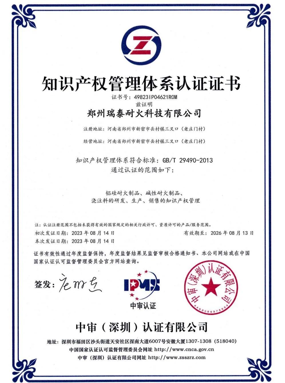 近期,郑州瑞泰顺利顺利获得GB/T29490-2013知识产权管理体系认证并取得证书,这标志着公司在知识产权管理规范化标准化运行方面取得认可,进一步增强了市场竞争力。