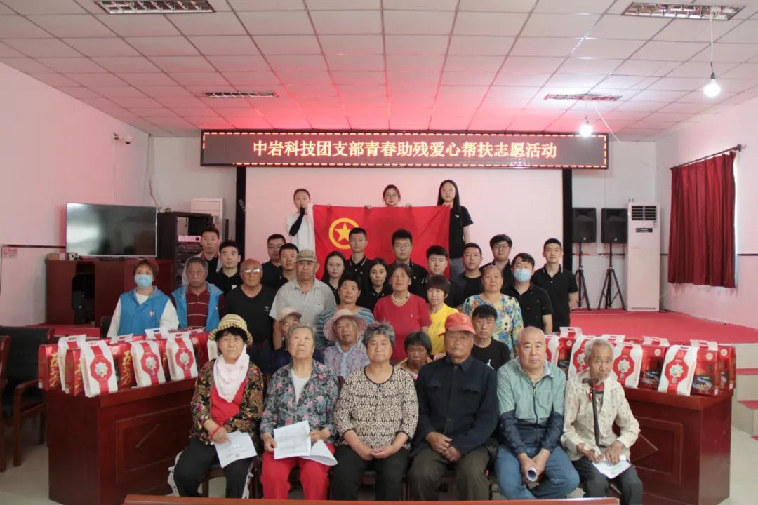▲中岩科技团支部召开“青春助残 爱心帮扶”活动,为20户残障家庭送去集团“禾苞蛋”扶贫产品和粽子