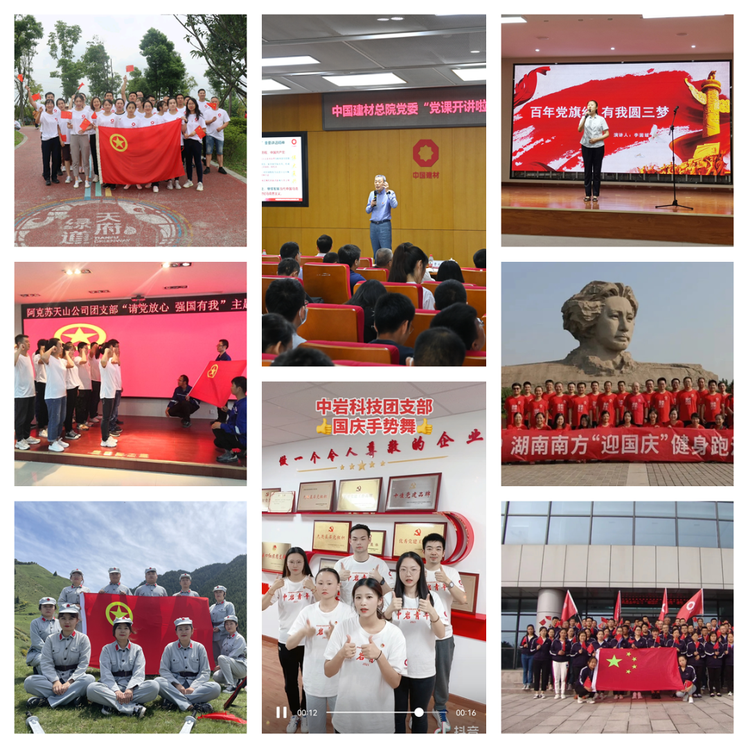 新疆天山水泥阿克苏天山团支部在“请党放心 强国有我”主题团日中重温入团誓词,围绕总书记讲话精神召开研讨分享;筑友商混公司团员们围坐在团旗周围,以“祖国我想对您说”为主题畅谈个人体会,为党和祖国献上最真挚、最美好的祝愿。