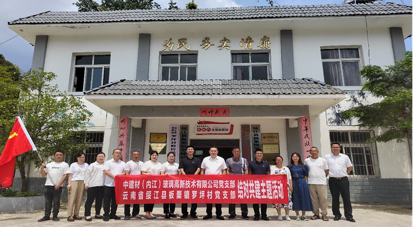 在云南省绥江县,中建材(内江)玻璃高新技术有限公司团支部组织党员到集团援建的罗坪村易迁安置点学习调研,分析乡村振兴成果并与罗坪村团支部签订结对共建协议,还向罗坪村委捐赠了党建图书、会议桌椅和电脑等办公设备。