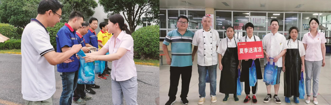 扬州中科工会先后为奋战在生产一线、项目一线、食堂等工作岗位上的职工送去了花露水、矿泉水、药品等防暑物品,对一线辛勤工作的职工表示感谢,叮嘱他们夏季炎热注意防暑,做到劳逸结合,以良好的精神状态和健康的体魄投入到工作中。