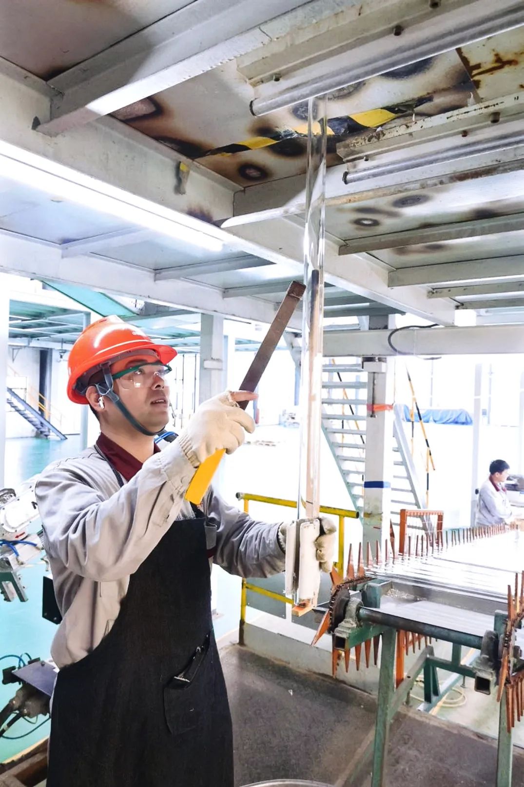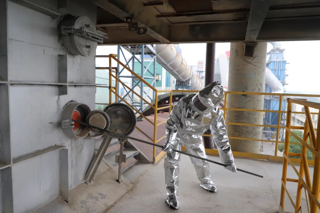 烧成岗位最“热”工位,每天要负责清理烟室6次,身着防护服,面对的都是高温的考验。