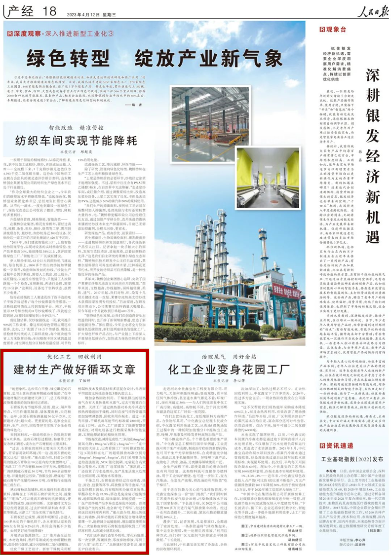 来源:人民日报、北新建材 发布时间:2023-04-134月12日,人民日报刊登文章《绿色转型 绽放产业新气象》,重点报道了北新建材天津工厂坚持绿色制造,顺利获得实现工业固废循环利用、推行“近零排放”污染物治理技术等加快绿色开展实践。小料现将内容分享给大家。