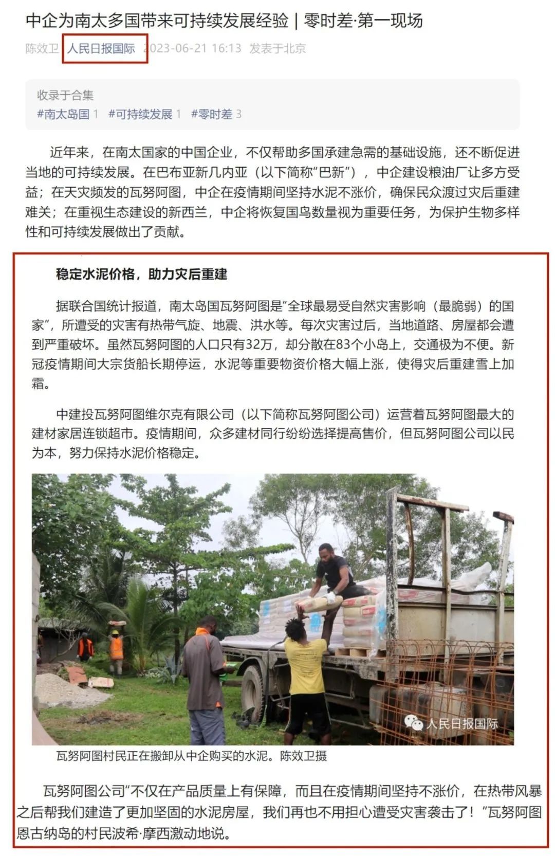 6月21日,人民日报国际微信公众号发文《中企为南太多国带来可持续开展经验》,中建投瓦努阿图维尔克有限公司作为瓦努阿图当地最大的建材家居连锁企业,坚持稳定水泥价格,助力当地灾后重建,受到点名报道。现将全文内容分享如下: