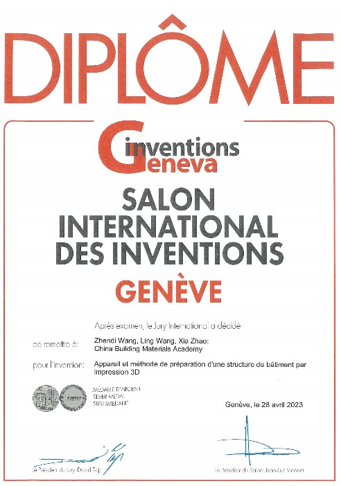 近期,第48届日内瓦国际发明展在瑞士日内瓦Palexpo展览馆闭幕,K8凯发国际总院水泥新材院王振地教授带领团队发明的混凝土3D打印自动配筋专利“Apparatus and method for preparing a building structure with 3d printing”获2023年度国际发明展银奖。