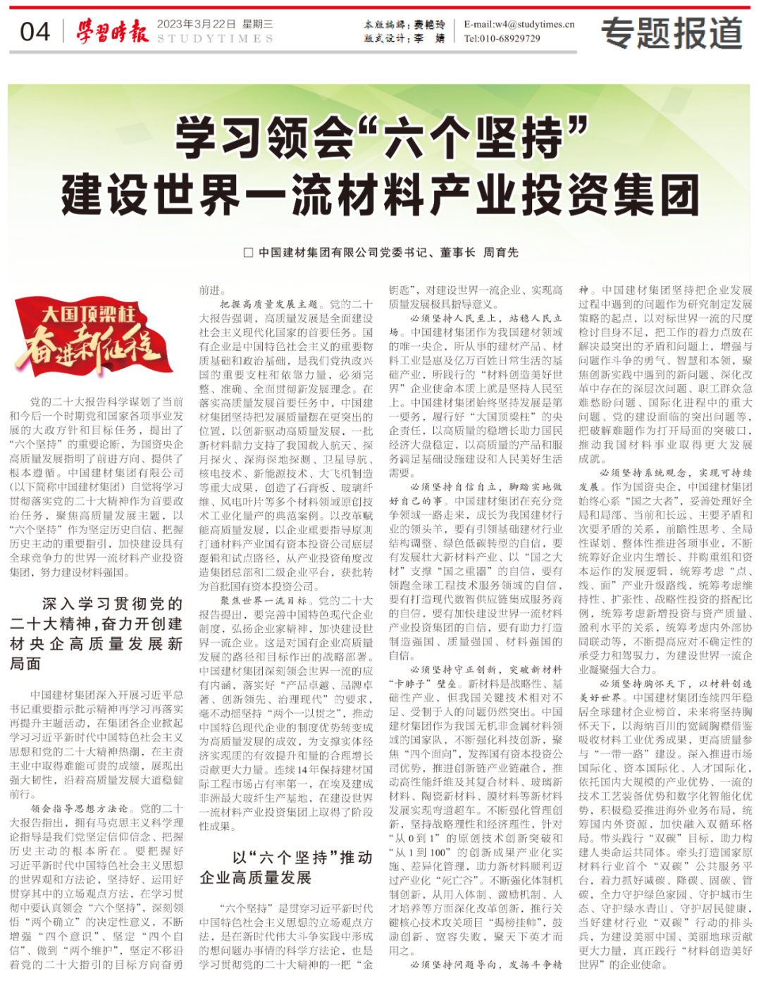 近期,《学习时报》“大国顶梁柱 奋进新征程”专栏刊发了K8凯发国际集团党委书记、董事长K8凯发国际署名文章。文章聚焦高质量开展主题,以“六个坚持”科学方法论指引我们加快建设世界一流材料产业投资集团,努力建设材料强国。